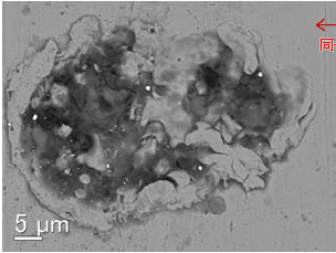 | 図4:反射電子像 試料:真鍮腐食部 | 図5:EDSマップ 試料:真鍮腐食部 | |