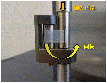 通常の回転型動的粘弾性装置ではパラレルプレートやコーンアンドプレートなどを用いてせん断流動の測定を行いますが、伸長粘度測定用治具(図1)を用いることで伸長流動の測定が可能です。測定は、試料を2つの円筒に熱融着させて、円筒を回転させて試料を伸長することで行われます。